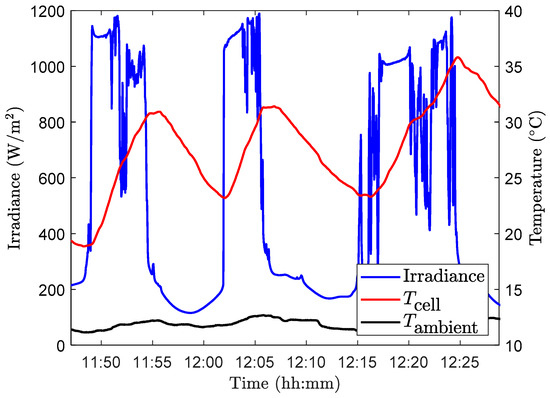 An example of irradiance, and ambient and PV cell temperatures during a partly cloudy period.