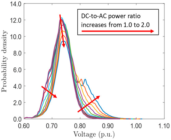 The probability density distributions of the operating voltage for DC-to-AC power ratios between 1.0 and 2.0 with a step of 0.1 during the observation period.