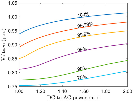 Operating voltage percentiles as a function of DC-to-AC power ratio.