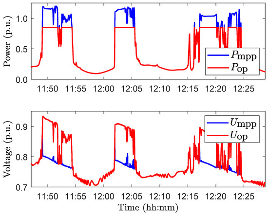 Figure 14 presents the operating and MPP power and voltage of a PV power plant with a DC-to-AC power ratio of 1.2 during the same partly cloudy period as presented in Figure 10. The power is normalized to the nominal STC power and the voltage to the nominal STC open circuit voltage of the PV generator. When comparing the MPP power to the irradiance in Figure 10, it can be observed that the power and irradiance profiles are not quite the same since the varying PV cell temperature affects the efficiency of PV panels. PV panel efficiency and, thereby, MPP power decreases with increasing PV cell temperature and vice versa. The effect of varying PV cell temperature can be seen also in the MPP voltage as well as in the operating voltage when the system is operating in power-limiting mode. Both voltages are significantly reduced due to increasing PV cell temperature. When the inverter enters the power-limiting mode after a shade period, there is a fast increase in the operating voltage. The power-limiting mode and the shape of the P–V curve explains the behavior of the high-end percentiles shown in the Figure 13.