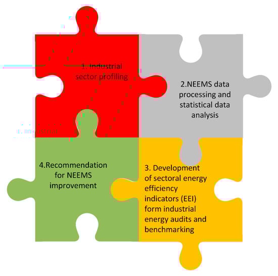 In the second step, we performed a statistical analysis of information available in NEEMS. The analysis was performed from May 2019 until October 2019. The aim of this step was to identify the correlation between the planned energy efficiency savings the program is delivering and the consumption level of the program’s participants, so that it could lead to the development of energy efficiency indicators (EEI) at sectoral and sub-sectoral levels and estimations of energy efficiency savings potential using a top-down approach. The sub-objective of this step was to examine the feasibility of constructing EECC, which could be further used to identify cost-effective industrial energy efficiency measures available, considering the technological and energy costs, and use them for industrial energy and CO2 savings estimation by using a bottom-up approach.