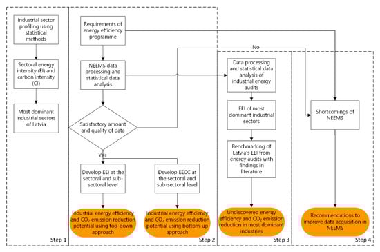 In the third step, we performed statistical analysis of 111 industrial energy audits available in NEEMS and calculated the average EEI for the most energy consuming industries in Latvia. The average EEI of the industrial sector (EEIS) were calculated as an arithmetic mean of individual EEIi, which measures the share of annual energy efficiency savings indicated in energy audits of total energy consumption (Equation (3)).
