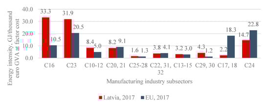 Energy intensity of industrial subsectors in Latvia and EU average (2017) according to [,].