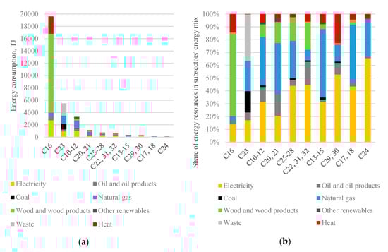 The most dominant industrial sector in Latvia both in terms of share of GVA at factor cost and energy consumption is the manufacture of wood and wood products (NACE C16); this sector consumed 62% of total industrial energy consumption in Latvia [] and produced 24% of total industrial GVA at factor cost in Latvia [] in 2017. An important aspect of detecting cost-effective energy efficiency measures is to correctly assess the market value of energy saved, since different MWh savings have different market values, and therefore, the determination of an actual energy mix of industries concerned is imperative. The actual energy mix also helps policy makers to evaluate the planned energy efficiency targets on climate goals, as different energy resources have a different climate footprint. Detailed information on Latvia’s industrial sector share of energy consumption and GVA, as well as its energy intensity (EI) and CO2 intensity (CI), are shown in Table 1.
