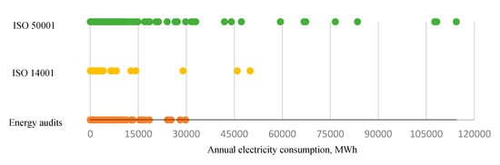 Noting the differences between energy audits, which are more representative of the current situation in the company, and the energy management systems that are a long-term strategy dedicated to continuous monitoring and improvement of energy efficiency [,], we first clarified which method (energy audit or energy management system) was more widely used and ranked them depending on the annual electricity consumption level, as this was the only common indicator for all companies. Figure 5 shows the distribution of submitted energy audits, ISO 14001 management certificates and ISO 50001 certificates according to the company’s electricity consumption. Figure 5 also shows that larger electricity consumers tended to choose management systems over energy audits, which could be explained by the higher cost incurred for energy audits of larger companies due to more complex production processes and relatively well-known procedures for the implementation of quality standards for larger companies.