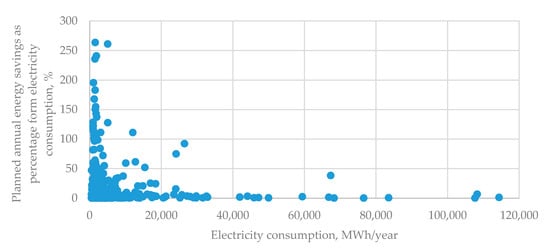 Furthermore, we tried to identify correlation between the planned energy efficiency savings the program is delivering and the consumption level of program participants so that it could lead to the development of EEI in sectoral and sub-sectoral industrial levels for estimations of energy efficiency saving potential. However, NEEMS only collected data on the electricity consumption of participants instead of on energy consumption overall; therefore, annual planned energy savings can exceed 100% of electricity consumption as the savings can be achieved in the final energy mix as a whole. Figure 6 shows weak correlation between annual electricity consumption and targeted or planned energy efficiency savings; hence, it is groundless to claim that savings can be derived from electricity consumption alone, and it is crucial that the NEEMS collects all energy consumption data.