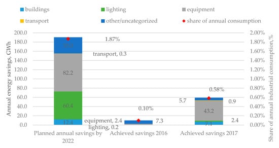 Planned annual savings and achieved savings (2016–2017) by specific activities, GWh (left axis) and share of annual industrial consumption, % (right axis).