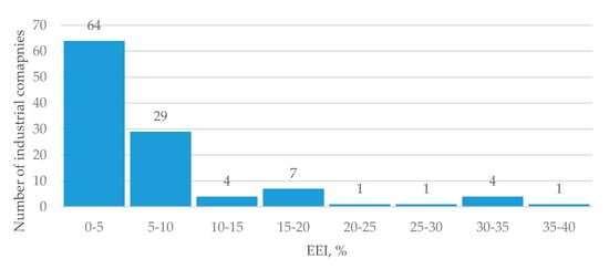 The histogram of EEI (see Figure 9) shows that 93 (i.e., 84%) of energy audits recorded EEI below 10% and 18 (i.e., 16%) reported EEI in the range of 10% to 40%.