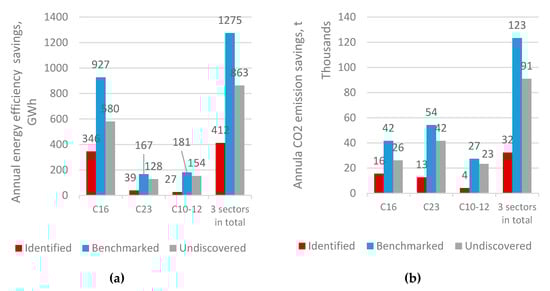 Identified, benchmarked and undiscovered annual saving potential in C16, C23, C10–12 and in all three sectors: (a) energy consumption (GWh), and (b) CO2 emission (thousand tonnes).