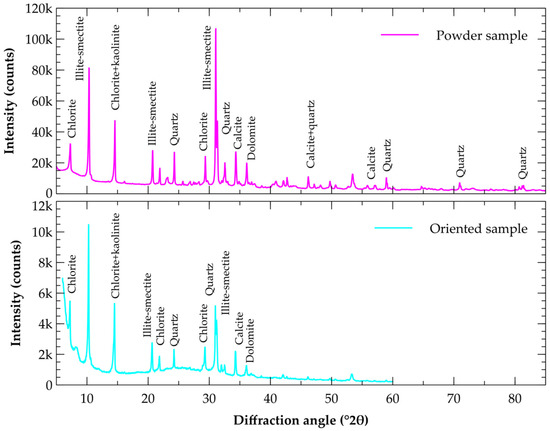 The approximate mineralogical composition of the clays is given in Table 3. It was obtained based on an analysis of results of XRD diffractometry (Aeris XRD diffractometer made by PANalytical (Malvern, United Kingdom) CoKα source, 40 kV, 7.5 mA, Bragg–Brentano geometry) on oriented and powder samples, being completed using thermogravimetry. The oriented samples were prepared for precise determination of the clay minerals content by the sedimentation of the clay fraction to non-diffraction Si plate and its subsequent saturation by ethylene glycol at 80 °C for at least 8 h. It was found that the most dominant minerals in the clays investigated are quartz (C1, C2, C3, and C5), kaolinite (C2 and C3), illite-smectite (C1 and C5), various feldspars (C2, C3, and C5), and calcite (C1 and C4). Feldspars are a group of tectosilicates in system orthoclase-albite-anorthite. A detailed specification of individual feldspars in the clays would be possible, but since it does not have a significant impact for this research, only their totals are presented in Table. The total amount of clay minerals in the samples ranges between 24% and 30%. Some samples also contain high amounts of carbonates and quartz, which was confirmed by their presence in the XRD diffractograms. However, only the diffractogram of C1 is presented as an example in Figure 2.