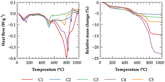 Due to the similarity of their thermal performances, according to their phase compositions, calcite content in particular, C2, C3, and C5 as well as C1 and C4 (see Table 3) are displayed separately (see Figure 8).