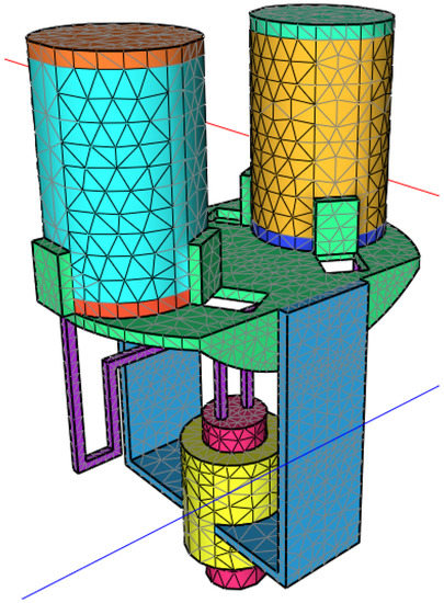 Computational mesh of the model-DSC sensor rod with reference and measurement crucibles. Reprinted from International Journal of Heat and Mass Transfer, 136, V. Kočí, J. Maděra, A. Trník, R. Černý, Heat transport and storage processes in differential scanning calorimeter: Computational analysis and model validation, 355–364, Copyright (2019), with permission from Elsevier.