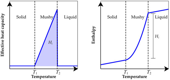 The concept of effective specific heat capacity is commonly used in building materials engineering as it allows involving latent thermal processes without a necessity of model extension, but just by a modification of input material properties. The values of effective specific heat capacity are then usually higher as their physical nature, but, in the field of computational modeling, they can be exploited very efficiently. An example of determination of such a parameter can be found, e.g., in the research presented by Lakatos and Trnik [30], who introduced the effective specific heat capacity of an aerogel blanket to incorporate thermal processes related to thermal annealing.