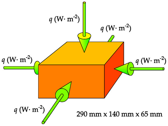 Having a rather comparable value, a simplified arrangement is assumed to estimate the energy demands. Precise calculations of the energy demands would require detailed specification of the furnace, type of fuel, and brick arrangement in the furnace, which is beyond the scope of this research. In this light, a sample made of the particular clays being heated from five sides by heat flux, q (W·m−2), with dimensions of 290 × 140 × 65 mm3 was chosen as an example, as depicted in Figure 6.