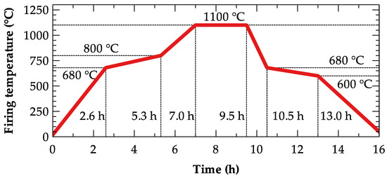 The main objective of the modeling procedure is to identify a heat flux vs. time function, q(t), that ensures the required firing temperature in the middle of the cube. Many factors affect the firing schedule, e.g. composition of the brick body, geometry and thickness of the ceramic product, furnace parameters, etc. For the energy demands calculations presented in this paper, the curve shown in Figure 7 was used [33]. The overall amount of energy demanded for firing, Q (J), is calculated as