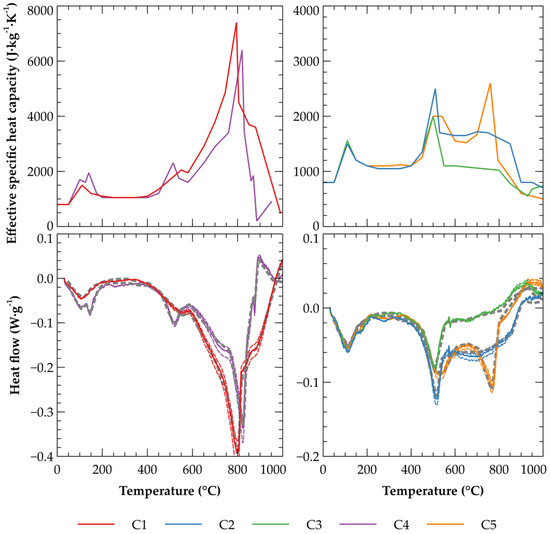 Using the computational model described in Section 2.2, the DSC curves presented in Figure 3 were analyzed to obtain the effective specific heat capacity of the particular clays that accommodate all the heat releasing/consuming processes that occur during burning. Additionally, these results are free of systematic errors as the model is able to treat heat losses due to thermal inertia of the device as well as due to heat redistribution before reaching the sensors.