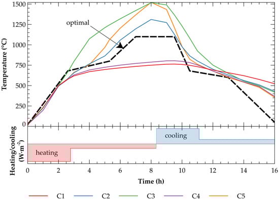 In the example presented in Figure 9, the heating boundary fluxes of 4000 and 1000 W·m−2 were applied, followed by the cooling fluxes of 3500 and 1000 W·m−2. While the temperature inside the samples made of C3 and C5 reached up to 1520 °C, the endothermic processes inside C2 led to a certain heat consumption that reduced the target temperature to only 1311 °C. Due to the heat consumption related to the decomposition of calcite and dolomite, the temperatures in C1 and C4 rose even less, to only 764 and 805 °C, respectively. It means that, in this case, samples C2, C3, and C5 would remain over burned after the firing procedure, while C1 and C4 would be not burned sufficiently when compared to the optimal scheme. Since the firing temperature is a key factor to achieve favorable material properties [41], the optimization of the firing scheme is important, bringing substantial energy savings as well.