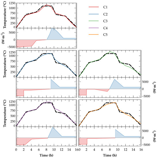 It is obvious that, by adjusting the boundary conditions, the temperature evolutions in the clay samples fit the optimal curve to a greater extent than in the previous case (see Figure 9). Each graph in Figure 10 is accompanied by a heat flux function, where the red color marks heating while the blue color marks cooling. The colored area then expresses the overall amount of energy related to one square meter of the sample required for reaching the optimal firing scheme. Due to a diversity of heating/cooling modes of the particular clays, a deeper insight is given in Table 5 describing the particular phases of the process.