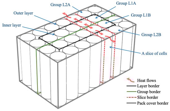 The thermal characteristics were reported in [] by heating the battery cell using different alternating currents. Considering the given pack geometry in Figure 2, the space between the cylinder cells is filled with air. The pack cover acts as thermal insulation and prevents the air from circulating out of the pack and aids in eliminating the heat loss from convective heat transfer.