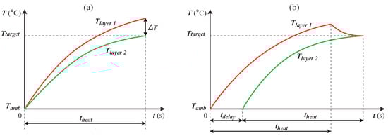 (a) Temperature imbalance between layers at the end of the conventional internal heating process. (b) Concept of temperature balancing by using the proposed heating schedule method.