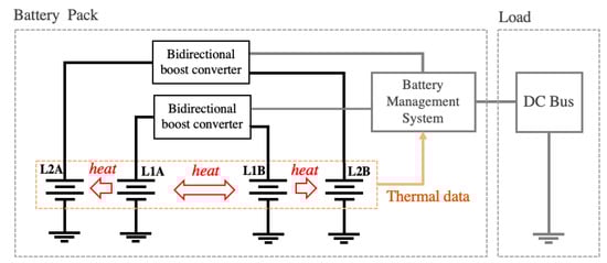 Based on the battery structure in Figure 2, we divide the pack into two layers, and each layer is further divided into two groups with the same thermal characteristics. The cells of the inner layer are divided into two groups, namely and while the cells of the outer layer are also divided into two groups, namely and , with the same electrical capacities. Two groups in the same layer are connected via a bi-directional DC–DC boost converter that performs a mutual pulse heating process. Two layers of cells require two independent converters that are controlled by a BMS and are activated separately to achieve optimal heating performance as demonstrated in Figure 4. The reference design for this converter is similar to the 4-switch buck-boost bi-directional DC–DC converter in battery backup power applications. In this study, the electrical conversion efficiency for each converter is set at 80% which is lower than that in practical conditions.