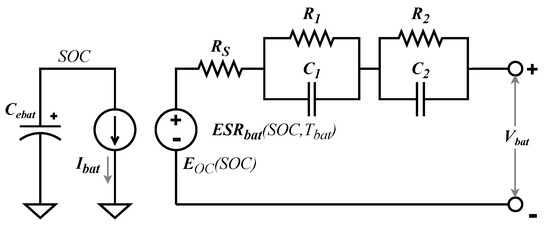 Battery pack modelling begins with a systematic analysis of a single cell. Electrical characteristics of a lithium-ion cell were analysed in []. Accordingly, a single cell can be presented by a comprehensive equivalent circuit model as shown in Figure 5. In the model, the capacitor is the full-charge capacitor that represents the nominal electrical capacity of one cell, which corresponds to 100% of SOC. This capacitor can be charged/discharged via applying current to the terminal in the rightmost part of the circuit.