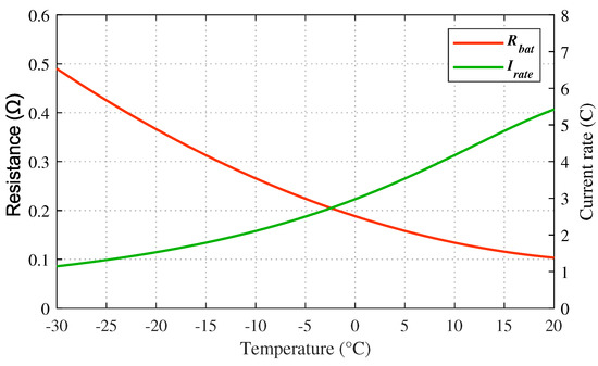 The cell impedance was inspected further in recent studies. In [], resistors and in Figure 5 remain unchanged during discharging in a wide range of temperatures from -20 C to 5 C while serial resistance () becomes a dominant part of the cell impedance. Based on [,], the heat generation is calculated by using a single lumped internal resistance () that includes heat dissipation through and pairs of the equivalent circuit model. The resistance was also examined in [] for charging and discharging at different SOCs and indicated similar resistance-temperature dependence for a wide range of temperatures. Another study [] revealed the relationship of internal impedance and the cell temperature for Li-ion 18650 cells in a sub-zero temperature range from -30 C to 0 C. On that account, we adopt and extend that dependence to 20 C, as shown in Figure 6.
