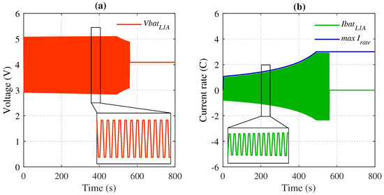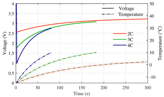 When a battery cell is discharged at a high rate in cold environment, the decrease in output voltage at the terminal of the cell can be excessively high due to the significant increase in internal resistance, thereby resulting in insufficient output power for the load. The effects of discharging a 18650 cylinder cell at different discharge rates on terminal voltage and battery temperature at -15 C are demonstrated in Figure 7. During these discharge processes, the cell temperature rises and leads to the decrease of its internal resistance and thus the terminal voltage of the cell rises up by the time. Based on the voltage and temperature responses, increases in discharge current decrease heating time but also decrease discharge voltage. In mutual pulse heating, increases in discharge current from a group is the rise of charge current and charge voltage for another group. Furthermore, increases in the charge voltage can lead to the possibility of lithium plating on the anode of the cell []. Therefore, the terminal voltage should be maintained above a certain threshold voltage (). In this case, the battery can only be allowed to discharge at a certain magnitude based on its temperature that is represented as the maximum discharge rate () in Figure 6 and is determined by: