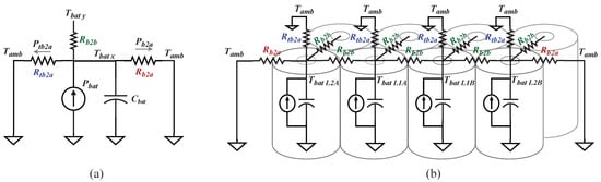 The heat transfer between a cell to another cell inside the battery pack and heat dissipation to the environment are simplified by using heat transfer models. Figure 8a illustrates the thermal model of a single cell and Figure 8b shows the thermal model for a slice of cells. In these models, the heat capacitor is charged as heat is generated internally from . Similarly, the heat capacitance of the cell decreases when the cell begins to lose heat through thermal resistors , and . The heat transfer in the battery pack is modelled by analysing a slice of battery cutting through four groups of cells in a manner is similar to other slices in the battery pack. In the model, the heat dissipations from one cell to other cells that exhibit lower temperature and to the outside environment through the pack cover are also evaluated.