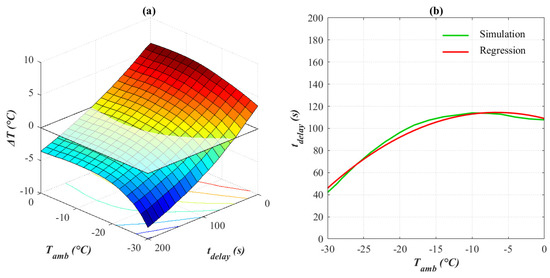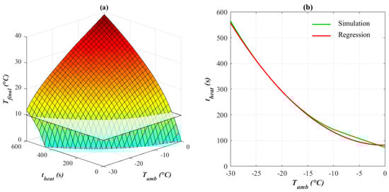 In the second scenario, the heating duration required to heat the battery pack to reach the target temperature corresponding to the ambient temperature is examined. We apply Equation (14) for while varying , and remaining other factors. In this case, the final heating temperature is demonstrated in Figure 10a. Similarly, another regression model is used to present the dependency of on to meet = 10 C as shown in Figure 10b and expressed as: