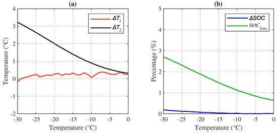 Figure 13a shows the temperature difference between the inner layer and outer layer at the end of mutual pulse heating process at different ambient temperatures, in case of inserted and non-inserted the idle period. At extreme condition C , temperature difference is reduced by 3.03 C (from 3.2 C to -0.17 C) by inserting the idle period. In general, the timing control method delivers better temperature uniformity when the temperature difference is lower than 0.38 C for a wide range of ambient temperatures. The consumed SOC percentage () and SOC difference corresponding to the ambient temperature are shown in Figure 13b. As previously mentioned, when using mutual pulse heating, energy consumption is lower than 2.8% and the SOC difference is lower than 0.19% even in the case of a heating range of up to 40 C (from -30 C to 10 C) and the electrical conversion efficiency is set at only 80%.