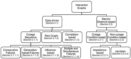 In addition to the review of various methods for constructing interaction graphs, various reliability analysis and studies performed using these graphs are also briefly reviewed. Some studies of interaction graphs are focused on identifying critical components in the cascade process of power grids [,,,,,,,,,,,,,,,,,,,,,,,]. These studies can have different purposes such as (1) identifying the vulnerable or most influential components of the system in the cascade process by utilizing standard centrality metrics [,,,,,,,,] or defining new centrality metrics [,,,] and (2) identifying the set of components whose upgrade (for instance, by increasing the power flow capacity of transmission lines) or protection can help in mitigating the risk of cascading failures and large blackouts [,,,] or quantifying the performance of the grids after addition of new transmission lines [,]. To characterize the latter, some works [,,,,] focus on the response of power grids to attacks and failure scenarios using metrics that quantify the efficiency of the grid before and after the attacks. Furthermore, to characterize the role of components in the cascade process, some efforts are focused on characterizing the patterns and structures in interaction graphs using community detection approaches [,] or tree structures [,]. Moreover, the work in [] uses interaction graphs to identify transmission lines that when switched off create partitions that limit the propagation of failures in the power grid. Some studies [,] also use the structures and patterns in interaction graphs to characterize and predict the distribution of cascade sizes. Similarly, structures in interaction graphs have been used for reliability analysis of zonal patterns [] and partitioning into voltage control regions [].