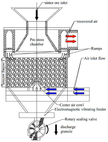 - Feng, J.S.; Zhang, S.; Dong, H.; Pei, G. Effect of gas inlet parameters on exergy transfer performance of sinter cooling process in vertical moving bed. Appl. Therm. Eng. 2019, 152, 126–134. [Google Scholar] [CrossRef]