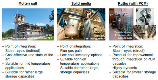 This paper was mainly written by M.K. under support from T.L. M.K. is the project leader of the FLEXI-TES project and supplied the part of solid media heat storage. F.K. provided the part of molten salt storage systems and P.K. supplied the Ruths-type steam accumulator part. The Ruths-type steam accumulator system with integrated PCM was the task of C.M. The power plant simulation and the comparative evaluation were mainly carried out by S.M. All authors have read and agreed to the published version of the manuscript.