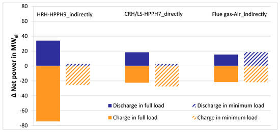 Figure 4 shows in this context the change in the net capacity during charging and discharging processes of the TES lead concepts in full load and minimum load of the power plant. The charging and discharging is partly carried out with different thermal capacities, which were determined in advance under consideration of limitations from the power plant process (e.g., minimum flow through the steam generator and steam turbine, maximum possible overload of the steam generator). For example, in the HRH-HPPH9_indirectly concept, a maximum possible thermal load capacity of 28 MWth is available for charging at the minimum load due to the minimum flow rate of the MP turbine to be taken into account, accompanied by a reduction of the net capacity by 25 MWel. Charging at full load can take place with a significantly higher thermal output of 80 MWth, which consequently results in a stronger effect on the net output of 74 MWel. Load-dependent thermal powers also come into play during the discharge, since, for example, the discharge in the direction of the high-pressure preheating section can at most replace the respective bleed steam at the integration point. Since the mass flows at the tappings decrease in the direction of partial load during normal operation, the achievable increase in net output during discharge also decreases significantly in the case of the two lead concepts concerned as the load on the power plant decreases.