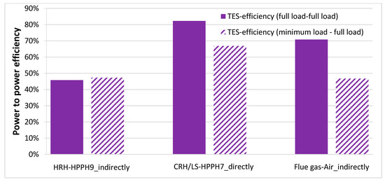 The HRH-HPPH9_indirectly concept based on the molten salt has a TES efficiency of approx. 47%, which is almost independent of the power plant load points under consideration. The CRH/LS-HPPH7_directly concept results in a round trip efficiency of 82% for the full load/full load operating strategy. Due to the charging of the Ruths-type steam accumulator with higher-quality live steam in the minimum load, the TES efficiency for the minimum load/full load operating strategy is reduced to 67%. The Flue gas-Air_indirectly solid media heat storage shows achievable TES efficiencies of between 47% and 71%, depending on the operating strategy.
