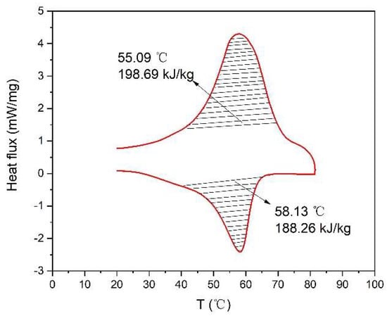 In order to test the active stirring heat transfer model, paraffin with a melting temperature of 58.13 °C was selected, which has the advantages of large latent heat, low volatility, non-toxicity, good stability and no overcooling. The experimental paraffin had a purity of more than 98%. As presented in Figure 1, DSC was used to measure the paraffin phase change temperature. The latent heat of phase change process was 188.26 kJ/kg, the solid sensible heat Cp,s was 1.72 kJ/kg K, and the liquid sensible heat Cp,l was 0.72 kJ/kg K.
