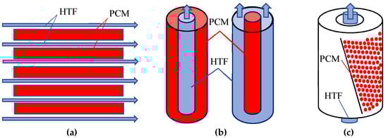 Generally, there is no direct contact between PCM and HTF for heat transfer, because this will lead to problems such as blending loss and how to separate it [23]. Basic structures of the heat exchangers are presented in Figure 2. There are plate type, shell and tube type and packed bed type. In these structures, the PCM always remains static without motion, and the dominant heat transfer mechanism of PCM is conduction.