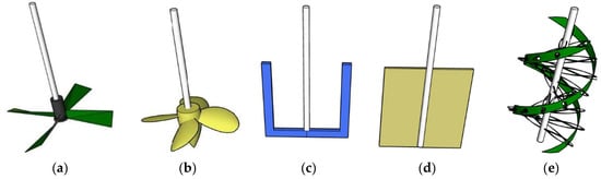 The existing stirring equipment is mainly used in petrochemical, pharmaceutical and other industries [24], the purpose of which is to promote more comprehensive chemical reaction and enhance heat and mass transfer. Stirring is also used in the field of food processing for scraper type heat exchanger [25]. The selection of stirrers is generally considered from three aspects: the purpose of stirring, the viscosity of the material and the volume of the stirring container. In addition, factors such as low power consumption, low operating costs and ease of manufacturing, maintenance should be considered. Typical stirrer types are paddle, turbine, anchor, frame and ribbon, etc. [26,27]. The structures are presented in Figure 3.