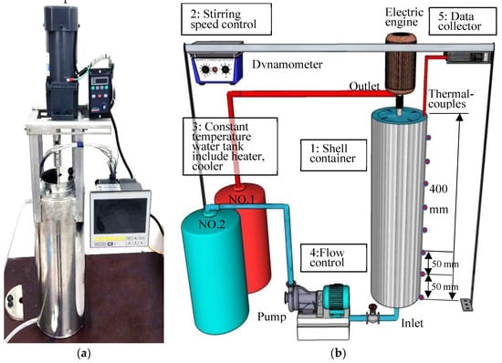 The real application of the active stirring model is presented in Figure 4a. The experimental test rig is presented in Figure 4b. The test rig mainly included five parts: shell container to store paraffin, stirring speed control, HTF inlet temperature control, HTF mass flow control and experimental data collection. HTF is the water. During the charging process, the water tank No. 1 used an electric heater to keep the HTF inlet temperature at a constant value. HTF entered from the bottom of the shell container and flowed out from the top of the shell container. Then HTF flowed to the tank No. 2. Solid paraffin in contact with the heat transfer surface heated and softened, and then was stirred. K-type thermocouples were used to measure the temperature of the HTF and determine the thermal parameters of the heat transfer process. From the bottom to the top of the outer column of shell container, there were 7 thermocouples arranged at intervals of 50 mm. Thermocouples were adjusted before use, and the measurement accuracy was ±0.5 °C. HTF mass flow was measured by a meter with a range of 0.5–15 L/min. A data collector model MR71VO1K15X was used to collect the data of mass flow rate, temperature and pressure. Stirring speed of the motor was 1250 r/min with rated power 90 W, and a 25:1 gear reducer was used to increase the torque. The output speed of the motor was adjusted through frequency conversion. The stirring speed adjustment range was 0–60 r/min. Active stirring energy consumption was measured by power meter which was connected in series to the electric motor.
