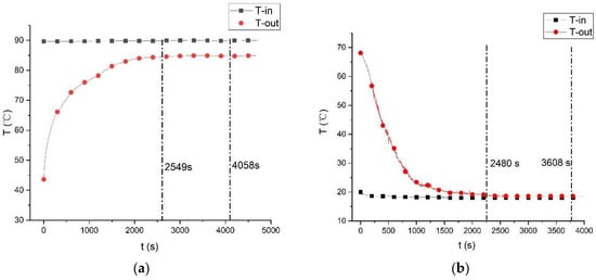 The determination of the total heat transferred time has an important impact on the analysis of the average heat transfer rate and the comparison of heat transfer effects with and without stirring. It is important to determine the phase change period time during the charging/discharging processes. However, it is difficult to determine it directly, hence an indirectly method was applied. According to the experiment and as presented in Figure 5a, the inlet temperature of HTF was higher than the outlet temperature of HTF due to the heat transferred to the PCM during the charging process. The inlet and outlet temperature difference of HTF at 2549 s and 4058 s was the same, which indicated that from 2549 s there no more heat transferred from HTF to PCM. From 2549 s, transferred heat was all lost. In Figure 5a, 2549 s was the total charging time. During the discharge process, as presented in Figure 5b, 2480 s was the total discharging time. The total amount of transferred heat was determined according to the total charging/discharging time.