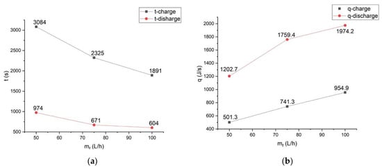 (a) Charging/discharging completion time under different mass flow rates, (b) charging/discharging average heat transfer rates under different mass flow rates.