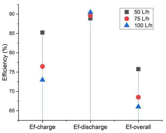 As presented in Figure 8, thermal efficiency during charging process decreased with increasing mass flow. This is because HTF of 100 L/h would make the shell reach a high temperature more quickly than 50 L/h, and the shell began to dissipate heat earlier. Heat loss is inevitable and charging efficiency mainly depends on heat loss. The more heat loss, the lower charging efficiency will be. Due to the same mass flow rate and same inlet temperature of HTF during the discharging process, the discharging efficiencies were almost the same. Therefore, in order to improve the overall thermal efficiency of the system, the mass flow rate should be reduced, but at the same time the heat transfer time will be increased. To balance efficiency and heat transfer rate, specific consideration should be made according to actual needs.