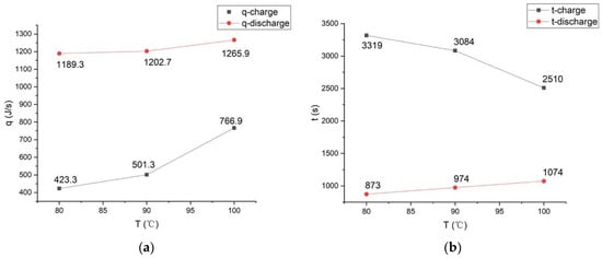 As presented in Figure 9a, with the increasing of HTF inlet temperature, the average charging rate increased rapidly. The larger temperature difference, the higher heat transfer rate will be. From 80 °C to 100 °C, the charging rates varied from 423.3 J/s to 766.9 J/s with an increase of 81.17%. The reason is large temperature difference enhanced the heat transfer. As presented in Figure 9b, increasing in the charging rate would shorten the time required for charging process. The charging time for the HTF at 80 °C and 100 °C shortened by 24.37% from 3319 s to 2510 s. As presented in Figure 10a, as the inlet temperature of HTF increased, the charging/discharging were all increased. HTF transferred 1404.9 kJ heat at inlet temperature of 80 °C and transferred 1924.9 kJ heat at 100 °C HTF. Discharging heat of 100 °C HTF was 1359.5 kJ which higher than 80 °C HTF by 30.94%.