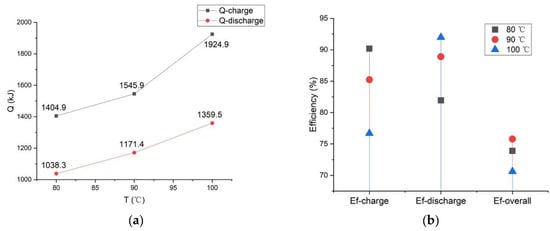 As presented in Figure 10b, first, the maximum charging efficiency under the condition of 80 °C HTF was 90.18%, and the minimum charging efficiency under the condition of 100 °C HTF was 76.69%. It can be considered that during charging process, the lower the inlet temperature, the higher the system’s charging efficiency. This is because higher inlet HTF temperature resulted more heat loss during the charging process. Second, the heat discharged from 100 °C case was the highest and the efficiency was the largest. This is because during the discharging process, the case of 100 °C HTF discharged more heat than 80 °C HTF. The charging/discharging efficiencies mainly depend on charging/discharging heat amount and heat loss. Under the same thermal insulation condition and same mass flow of HTF and inlet temperature of HTF during discharging process, the heat loss is nearly the same and discharging efficiency mainly depends on the discharging heat. Discharging more heat will result in a higher efficiency. Third, the case for the 90 °C HTF had the highest overall efficiency, because the heat loss was smaller than case of 100 °C during the charging process and charging heat was larger than case of 80 °C during the discharging process. Therefore, in order to improve the thermal efficiency, it is necessary to reduce the heat loss and increase the charging/discharging heat under the same heat loss condition.
