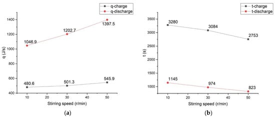 First, the stirring had a more significant effect on the discharging process than the charging process. As presented in Figure 11a, both the average heat transfer rate during the charging and discharging processes increased with the stirring speed. However, charging rate increased by 13.59% from 480.6 J/s to 545.9 J/s, and discharging rate increased by 33.49% from 1046.9 J/s to 1397.5 J/s, which was more than double growth rate of the charging process.