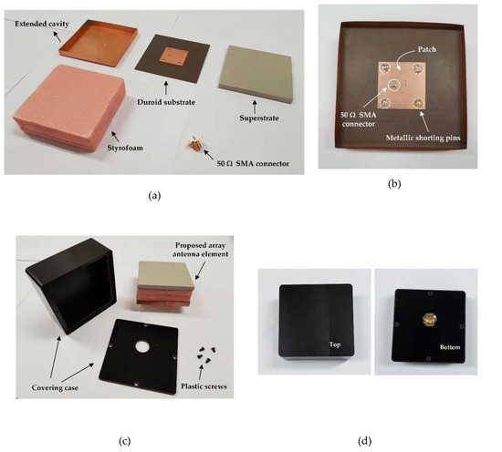 Figure 2 presents the photographs of the fabricated antenna on the Duroid substrate with the extended cavity structure and the high dielectric superstrate. The extended cavity is made by folding copper plates and welding the folded parts, as shown in Figure 2a. The radiating patch is printed on the Duroid substrate by etching technique, and the four locations for the shorting pins are perforated through the substrate. The thick high dielectric superstrate is made by stacking four layers of a high dielectric board (CER-10, Taconic). The 50 Ω SMA connector is placed at the bottom of the extended cavity structure to provide direct feeding with the patch. The metallic shorting pins are made by soldering the perforated holes from the patch to the cavity and filling them completely with lead, as shown in Figure 2b. A 23-mm-thick Styrofoam is used between the patch and the superstrate to place the high dielectric superstrate above the patch radiator, and the antenna is installed inside a covering case to protect it from any external damage as shown in Figure 2c. Figure 2d exhibits the fully assembled antenna element.