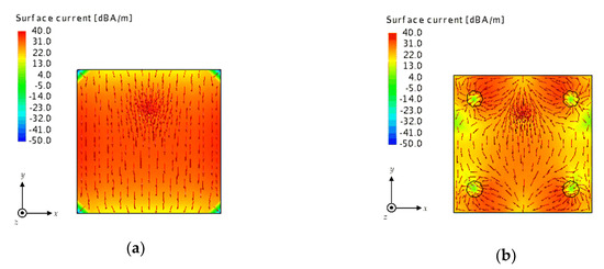 Current distributions: (a) Patch antenna without shorting pins and (b) patch antenna with shorting pins.