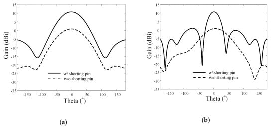 Two-dimensional radiation patterns with and without the shorting pins: (a) zx-plane and (b) zy-plane.