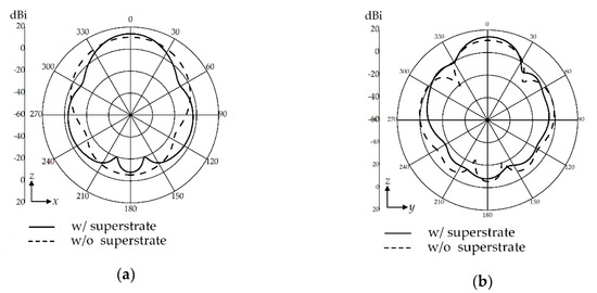 Two-dimensional radiation patterns with and without the superstrate: (a) zx-plane and (b) zy-plane.